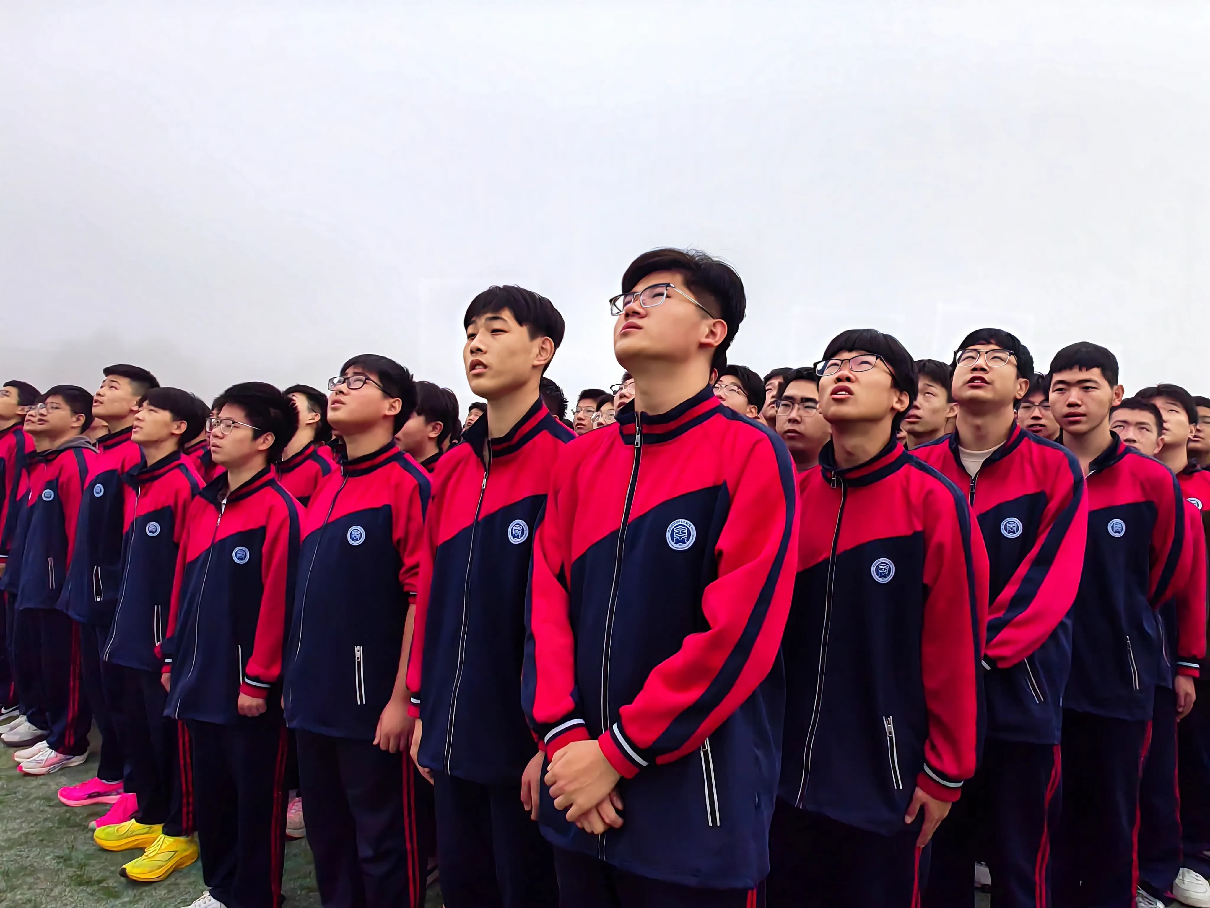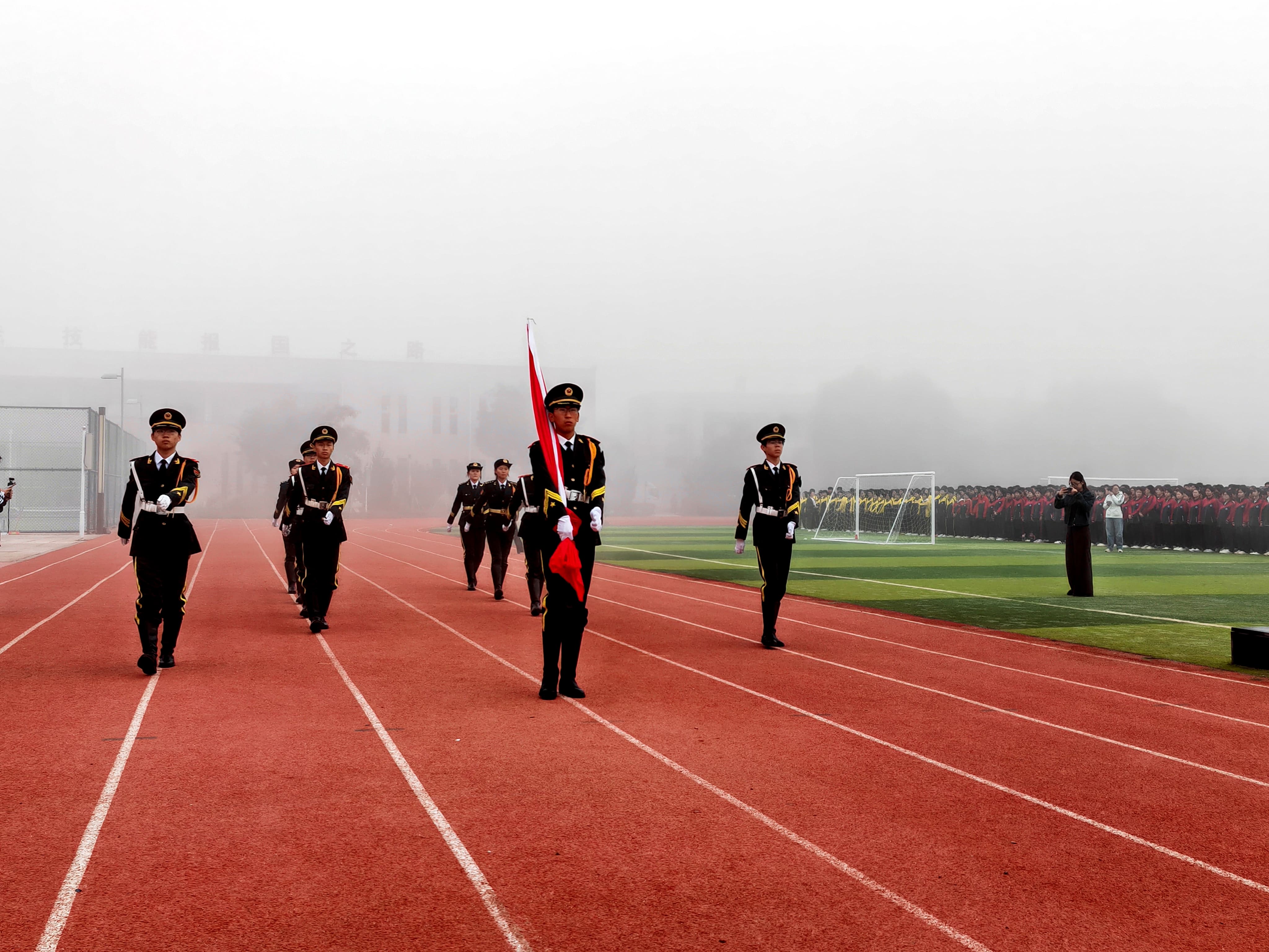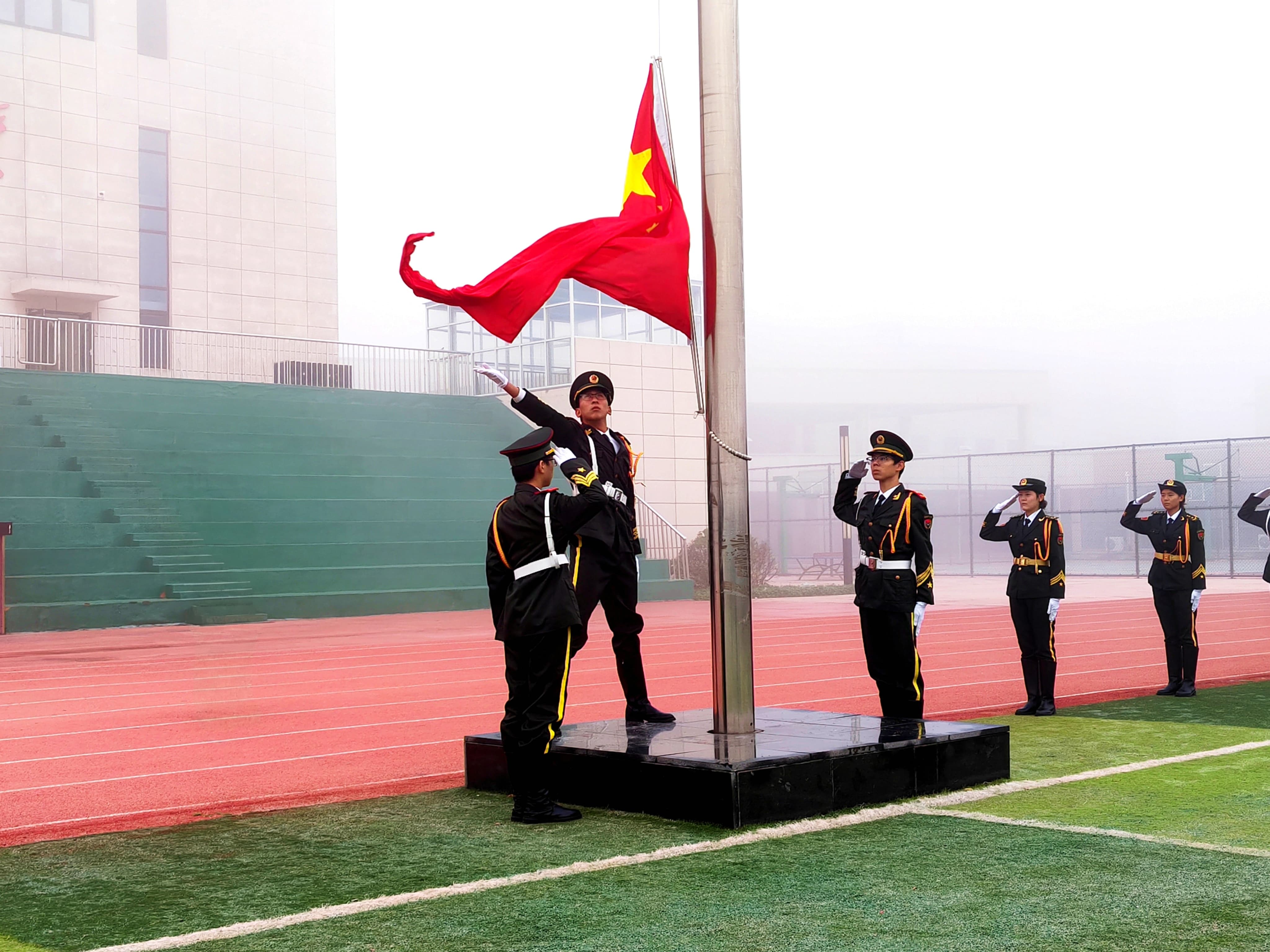 伴随着雄壮的《义勇军进行曲》,五星红旗冉冉升起,全体师生庄严肃立,行注目礼。
