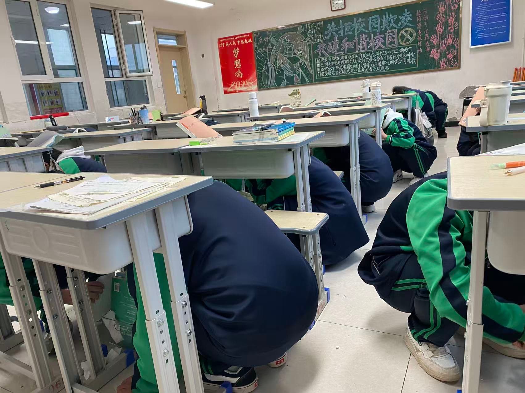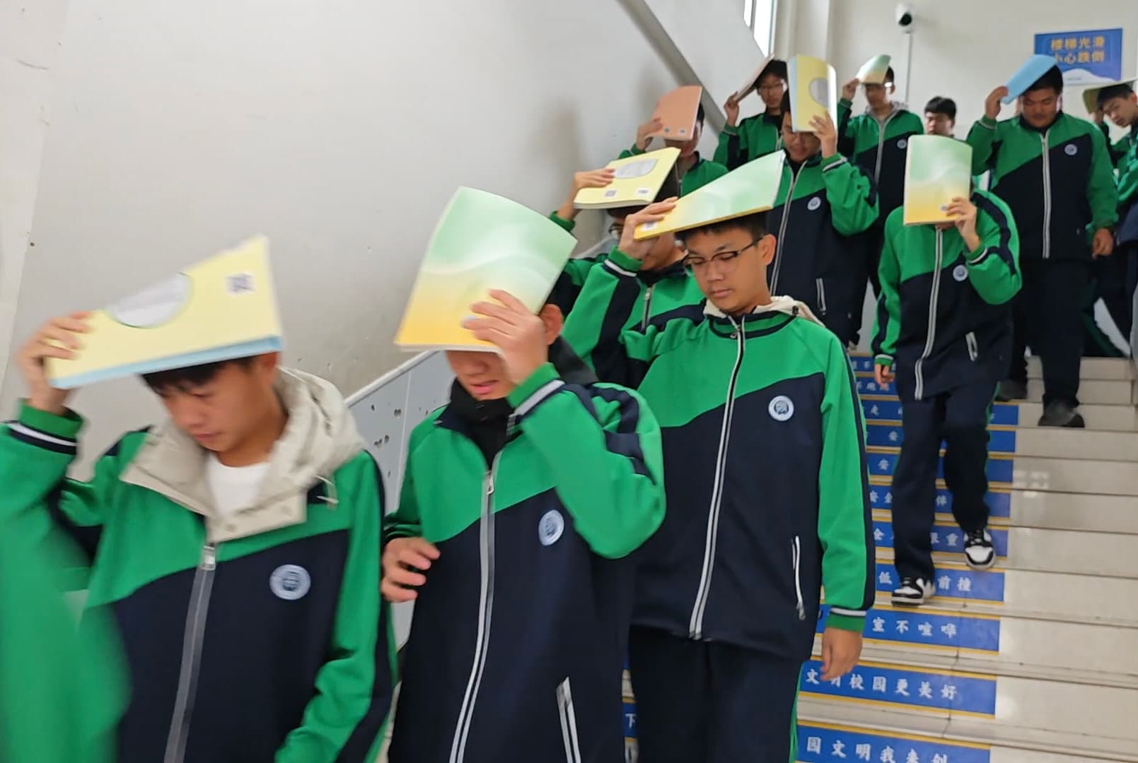 上午 8 时整,尖锐的防震预警警报准时响起,演练正式拉开帷幕。各班级学生在任课教师的即时指挥下,迅速采取“低姿、护头、躲桌下”的标准避险姿势,双手紧扣桌腿,将身体重心压低,整个过程反应迅速、动作规范;待第二次疏散警报发出后,学生们立即以书本护头、弯腰屈膝,沿着教学楼内预先规划的疏散路线快速有序疏散。楼层引导员提前到位,在楼梯转角、安全出口等关键点位全程疏导,及时提醒学生 “保持间距、快速通过”。整个过程紧张有序、衔接顺畅,仅用时2分12 秒,师生便全部安全抵达操场指定集合区域。随后,各班班主任迅速清点人数,逐一核对名单,并第一时间向防震演练总指挥长汇报疏散情况,确保 “不缺一人、不漏一人”。