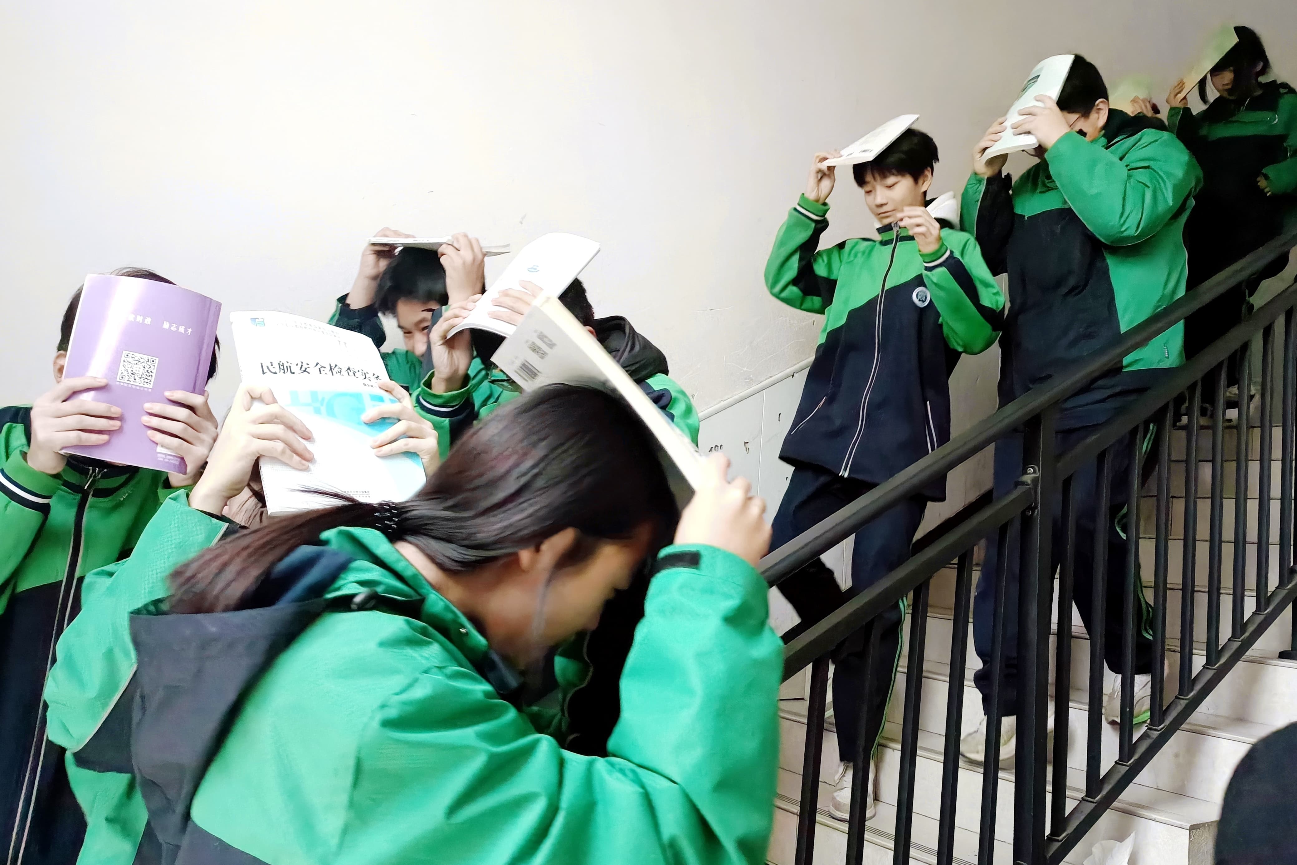 下午14:00整,随着校园内第一次急促的警报声骤然响起,上课教师立即停止授课,转而成为教室演练负责人,迅速指导学生按照“蹲下、掩护、抓牢”的要领,就近躲避在课桌下方或墙角等安全三角区,用书本或手臂保护头部。间隔约一分钟后,第二次疏散警报长鸣,所有学生在老师们的指挥下,弯腰低身、双手护头,按照预定疏散路线,快速、有序地向学校操场安全区域撤离,用时仅1分56秒,拓行楼师生全部安全抵达指定集结地点。