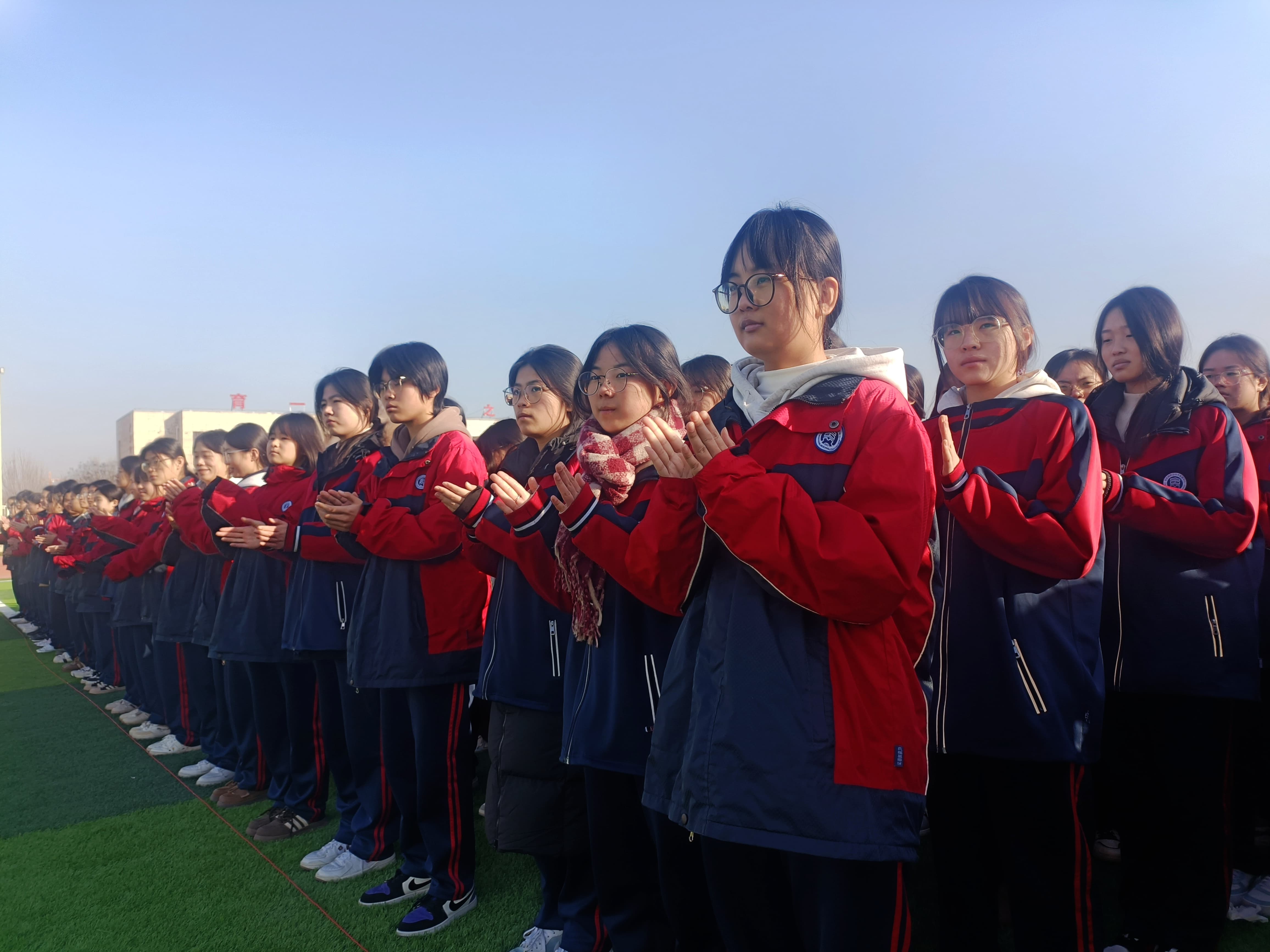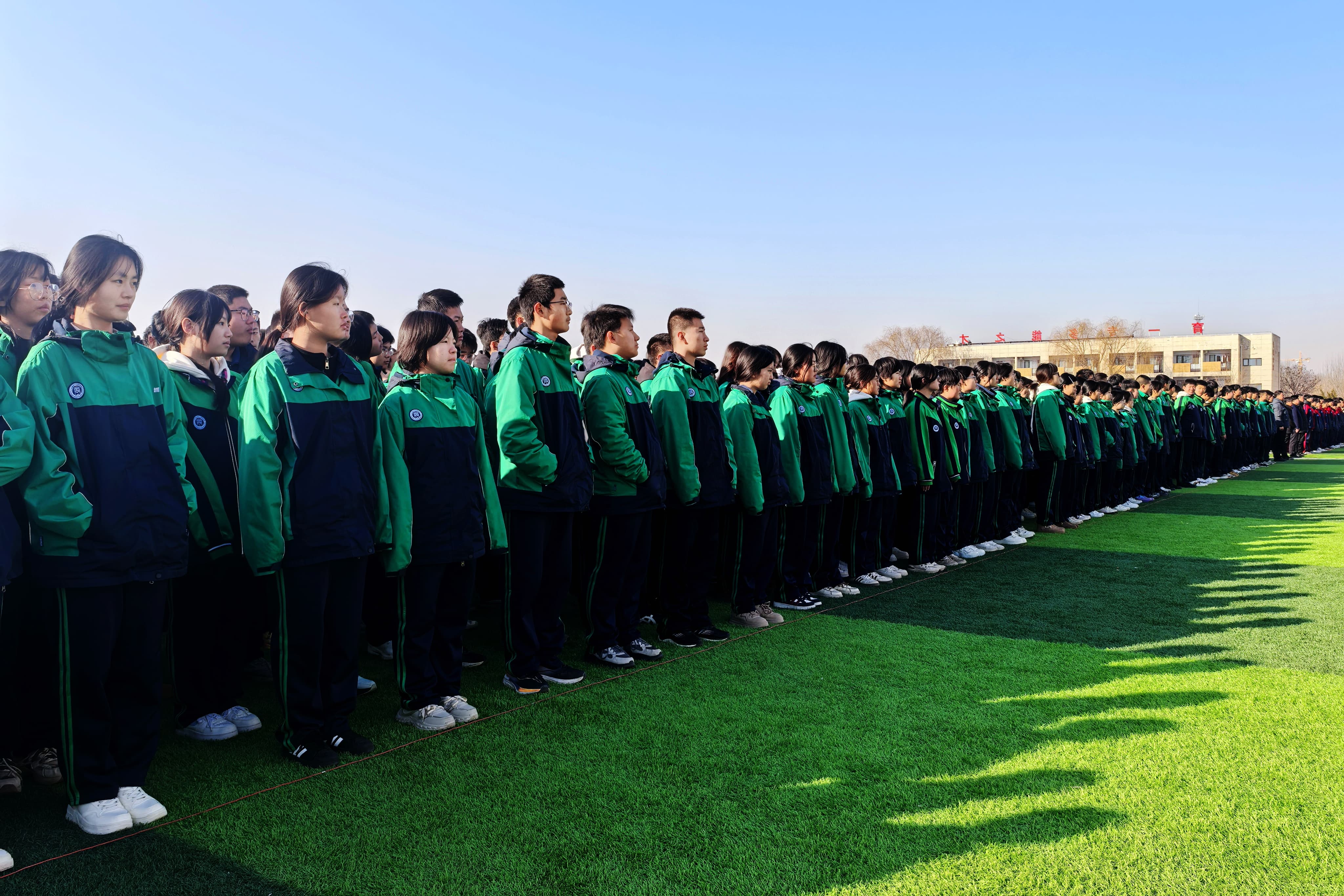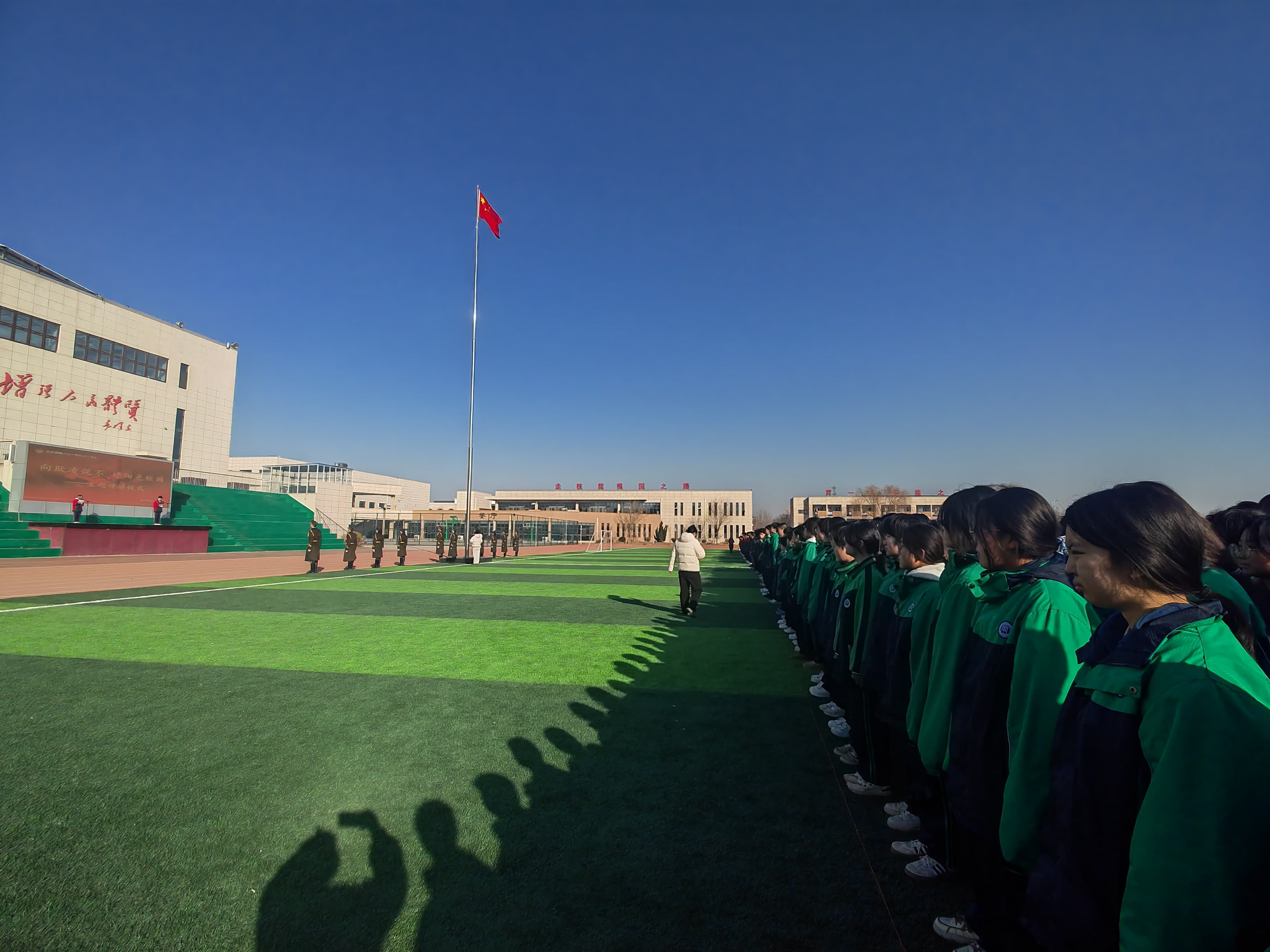 激昂的国歌声中,五星红旗冉冉升起,全体师生庄严肃立,行注目礼。