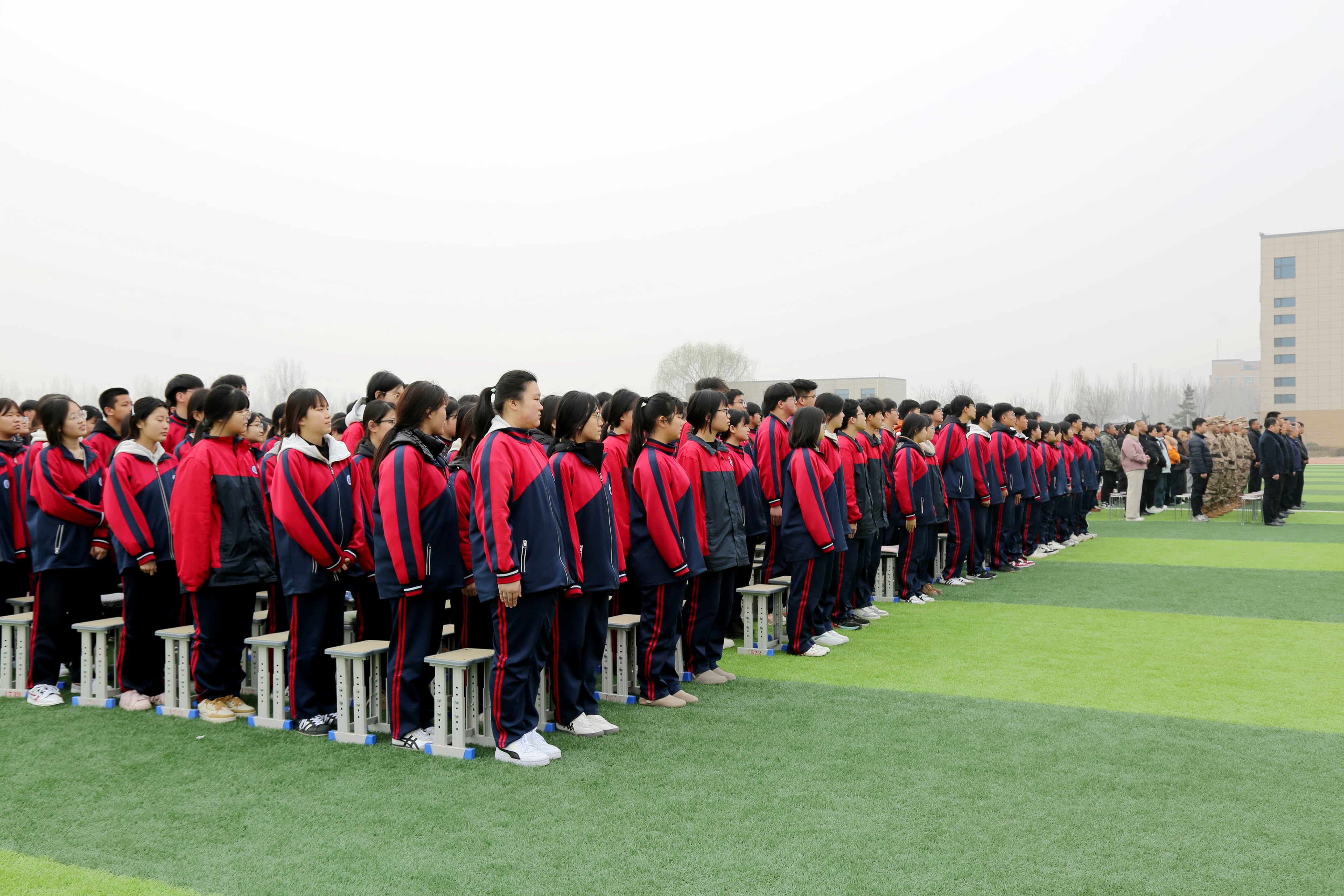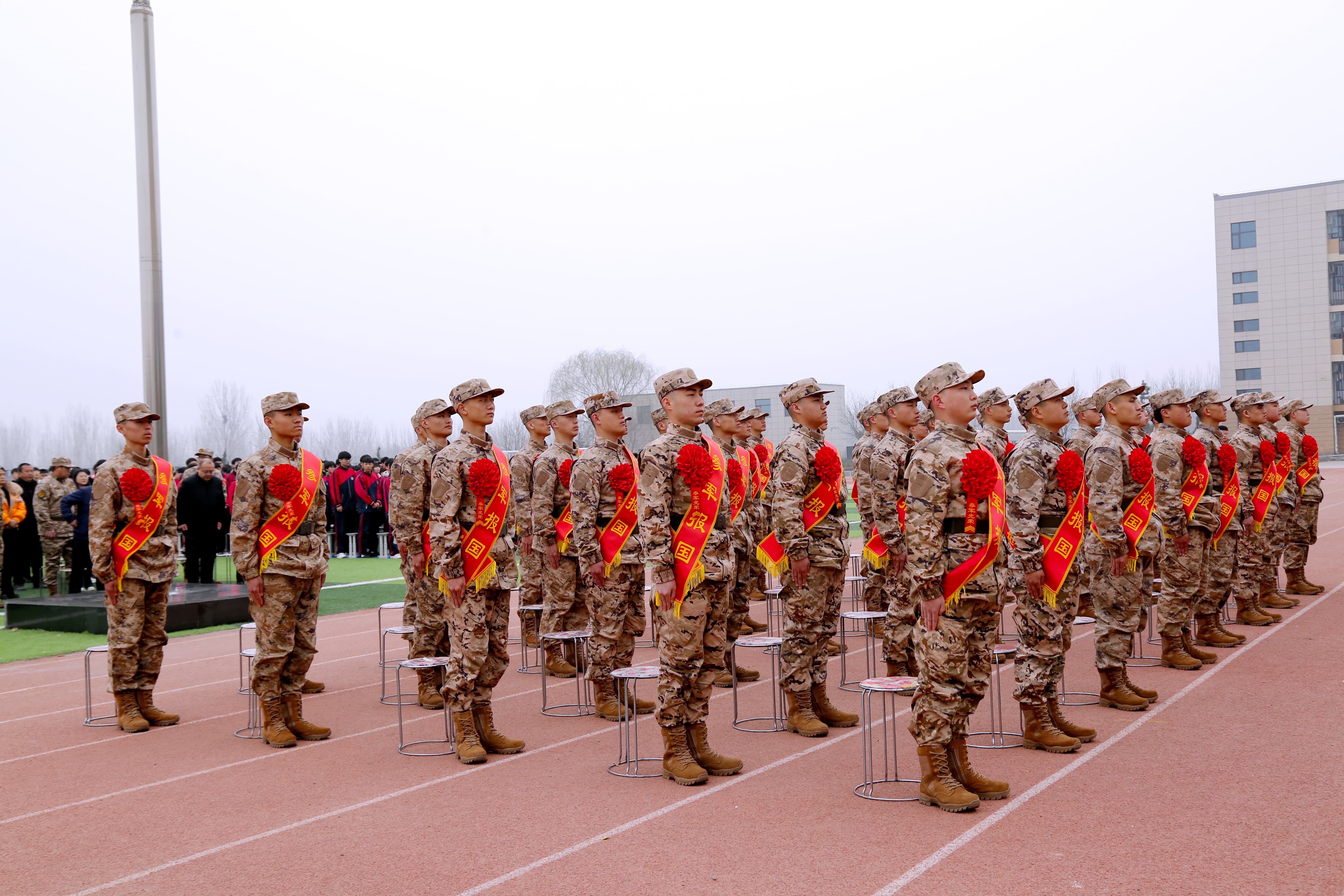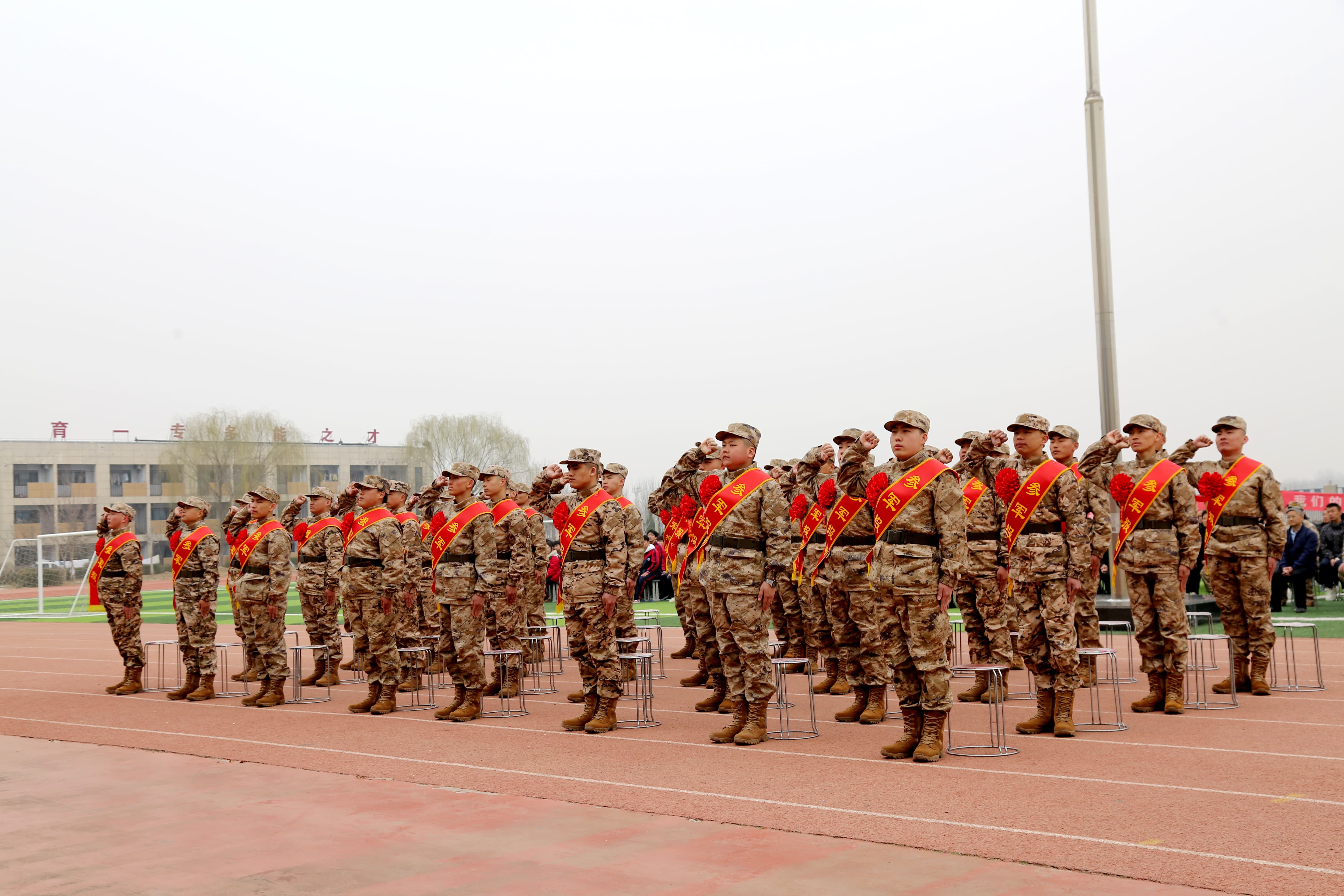 全体新兵高举右拳庄严宣誓,铮铮誓言响彻校园操场,彰显着青年一代的责任与担当。仪式在激昂的《中国人民解放军军歌》中圆满落幕。