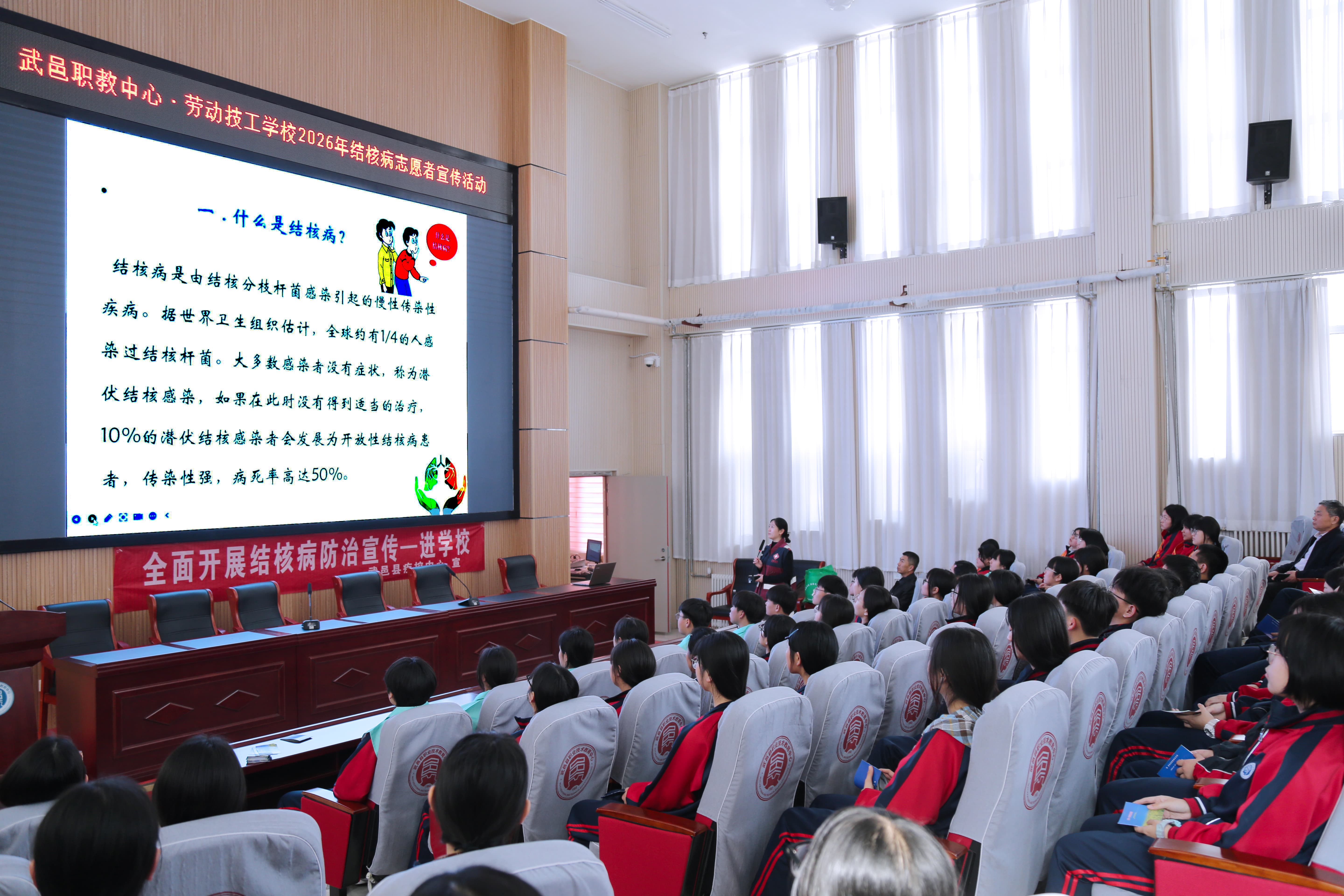 为进一步提高师生对结核病防治知识的知晓率,动员全体师生参与终结结核流行,3月23日,县疾控中心滕桂林主任、韦文静科长一行联合我校隆重举行以“防治结核,志愿有我”为主题的结核病防治志愿者宣传活动。