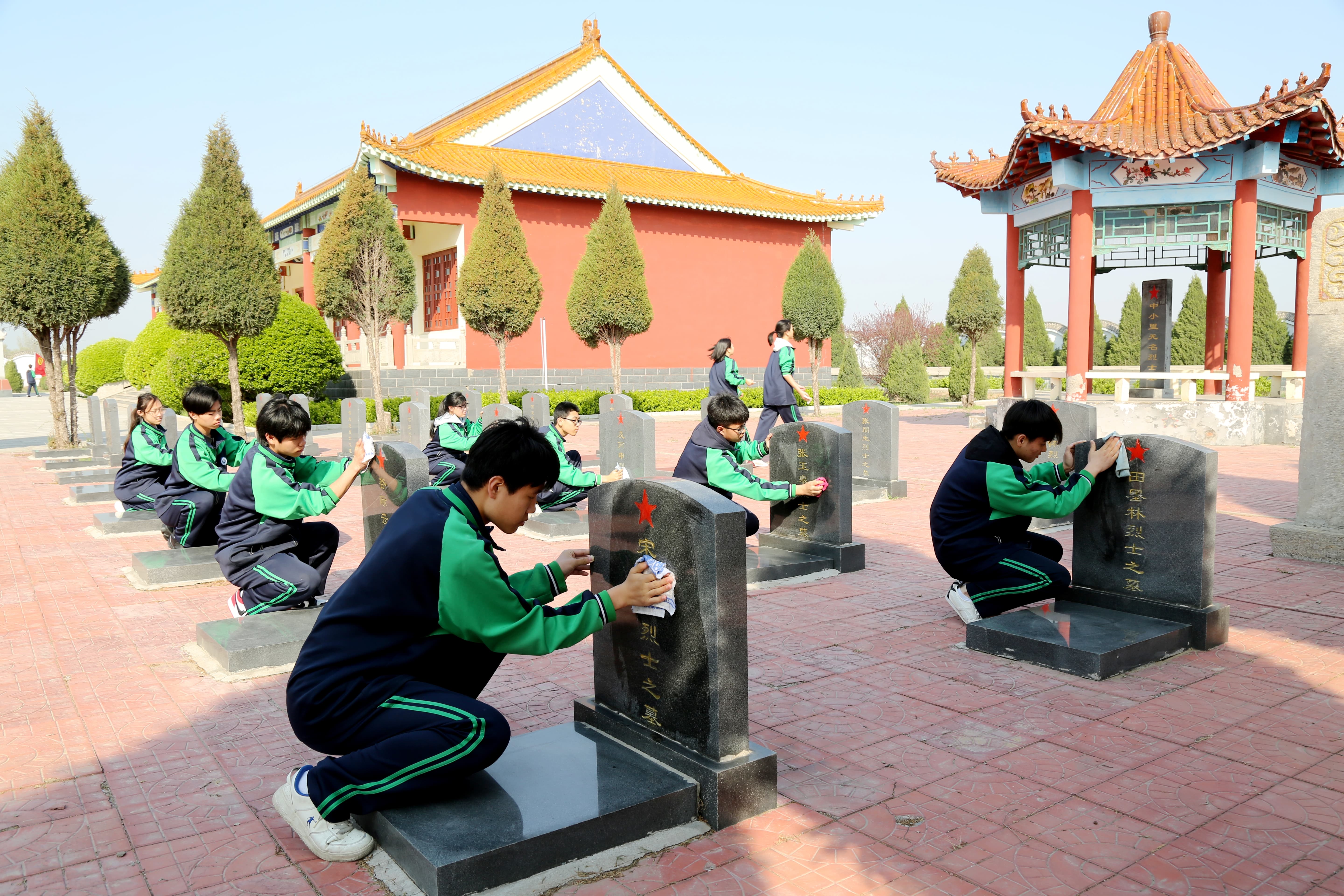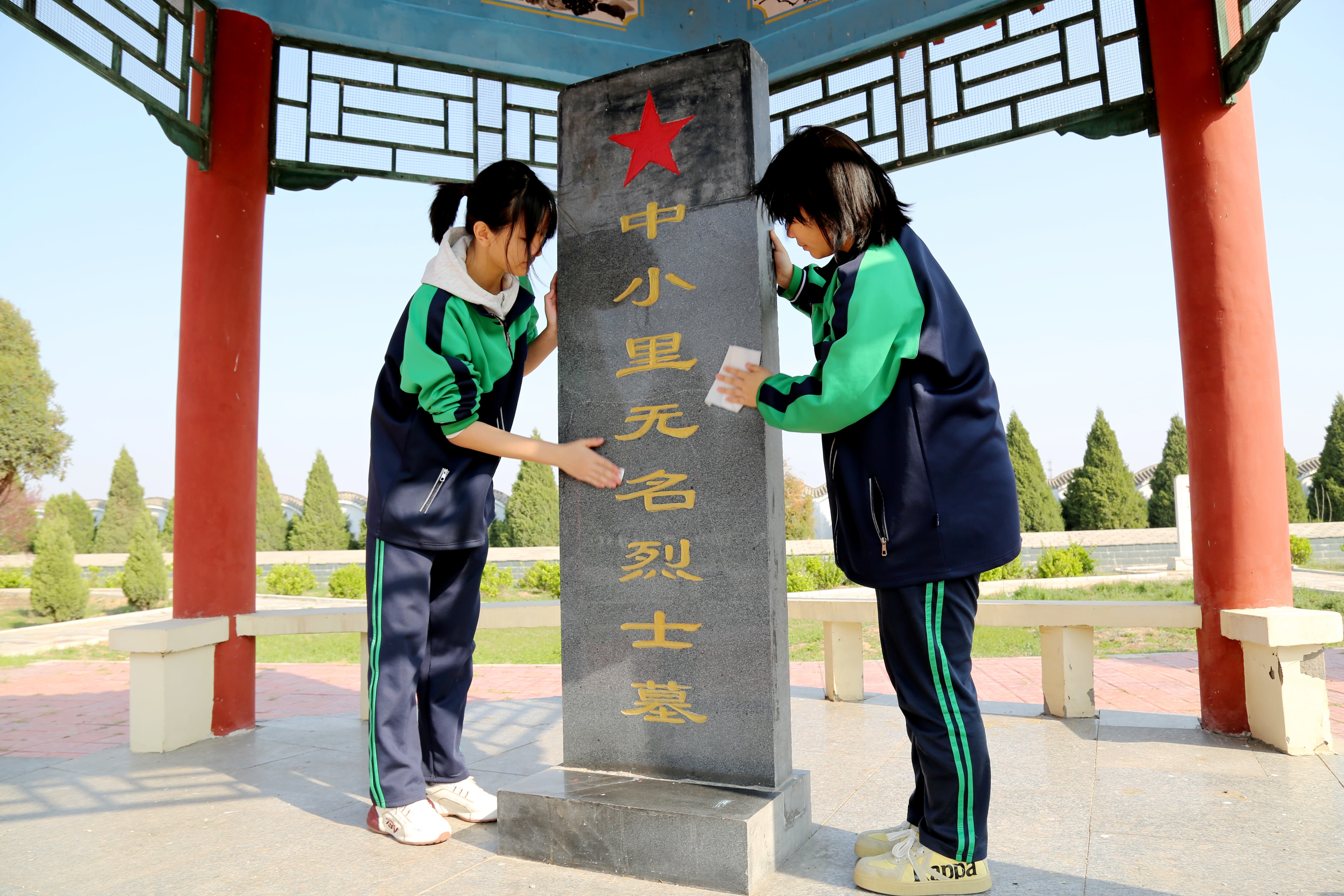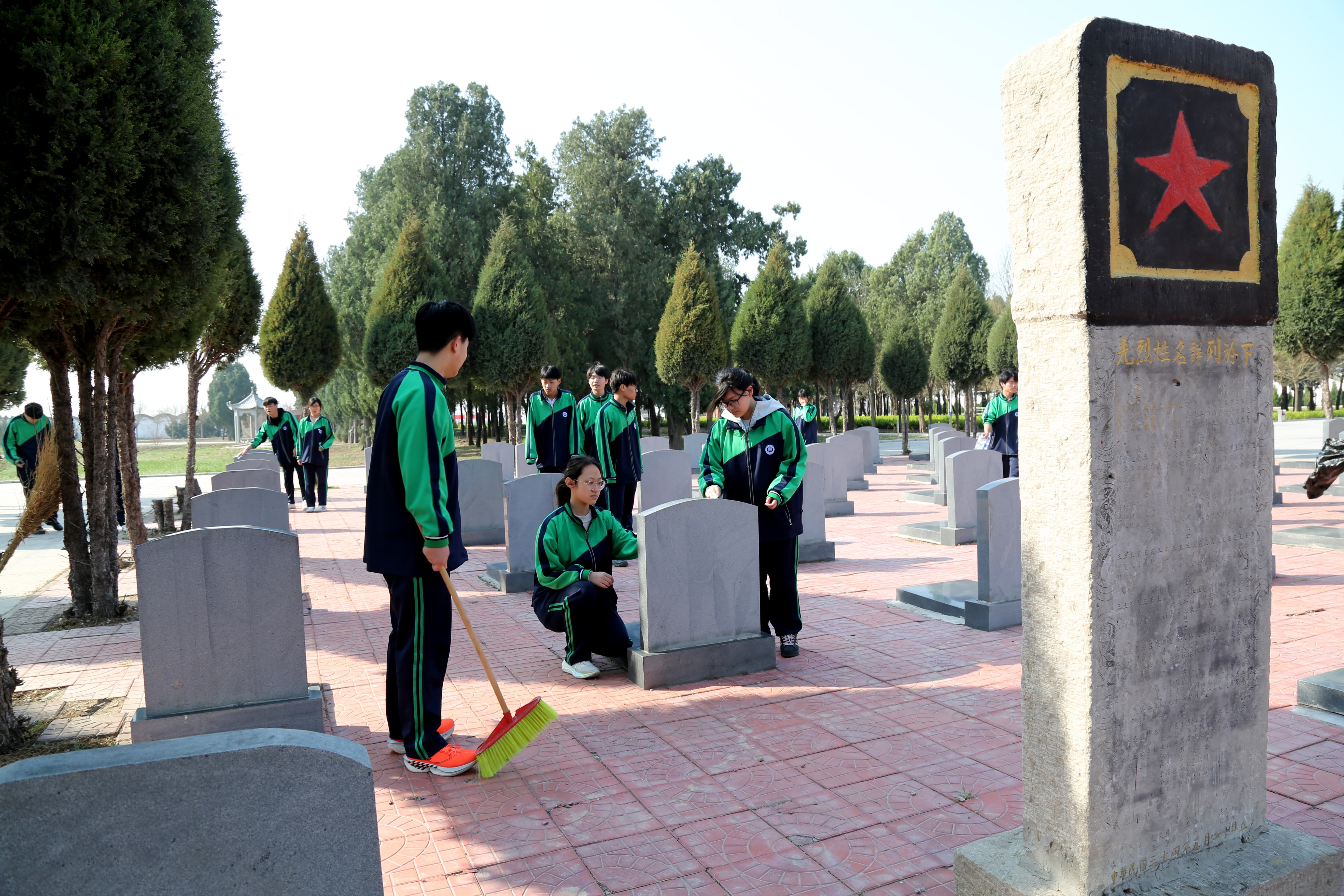 随后,同学们有序分组,细致清理陵园内的杂草与落叶,擦拭纪念碑,用实际行动呵护这片红色热土,以点滴之举告慰先烈英灵。