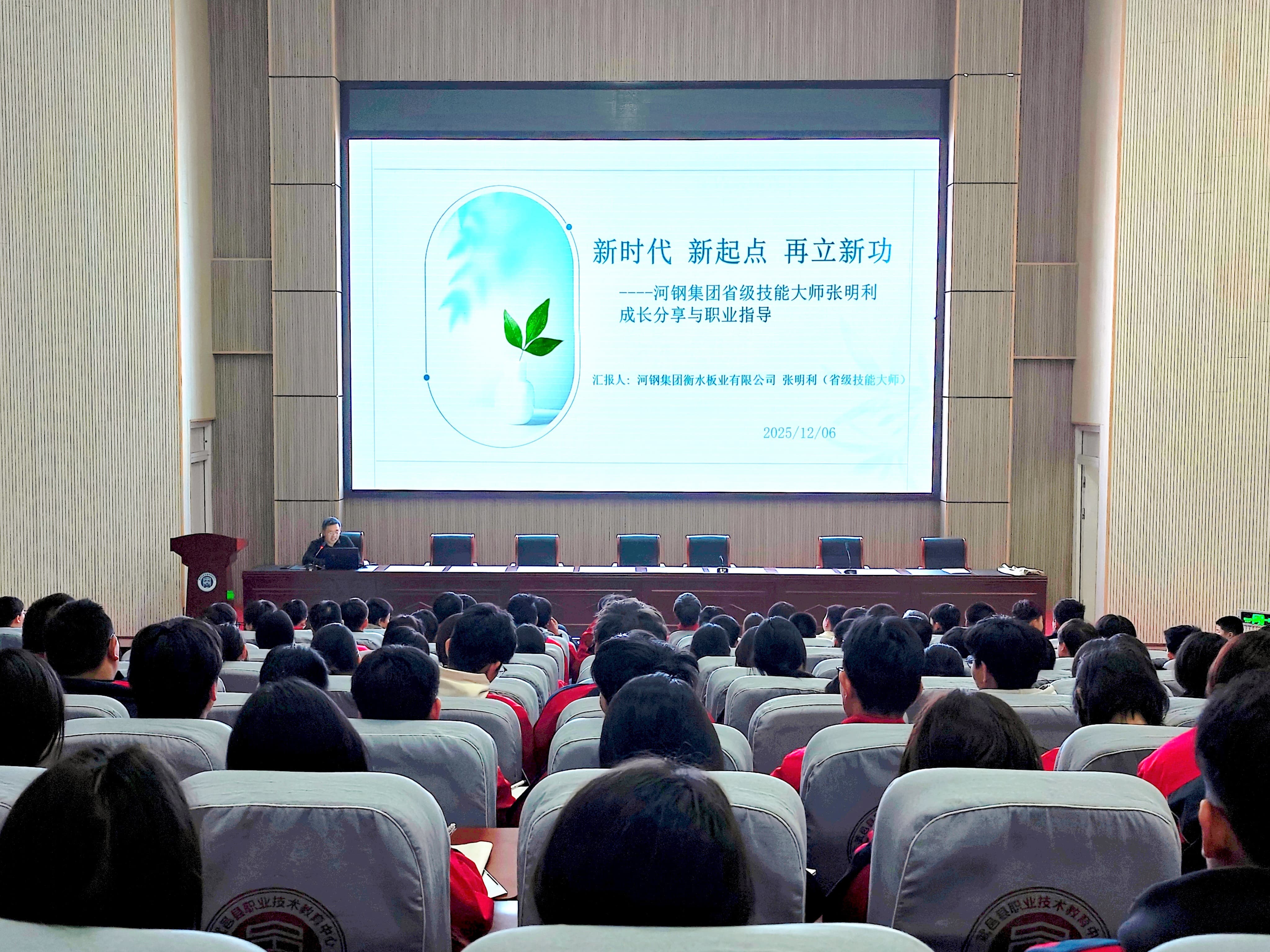 活动伊始,张明利大师在风雨操场三楼会议室带来题为《新时代、新起点、再立新功》的专题讲座。他以自身从一名中技生到省级技能大师的成长轨迹为主线,生动讲述了在平凡岗位上深耕不辍、追逐卓越的奋斗故事,以真挚的情感与深刻的感悟深深打动了在场每一位师生,让大家深受鼓舞。
