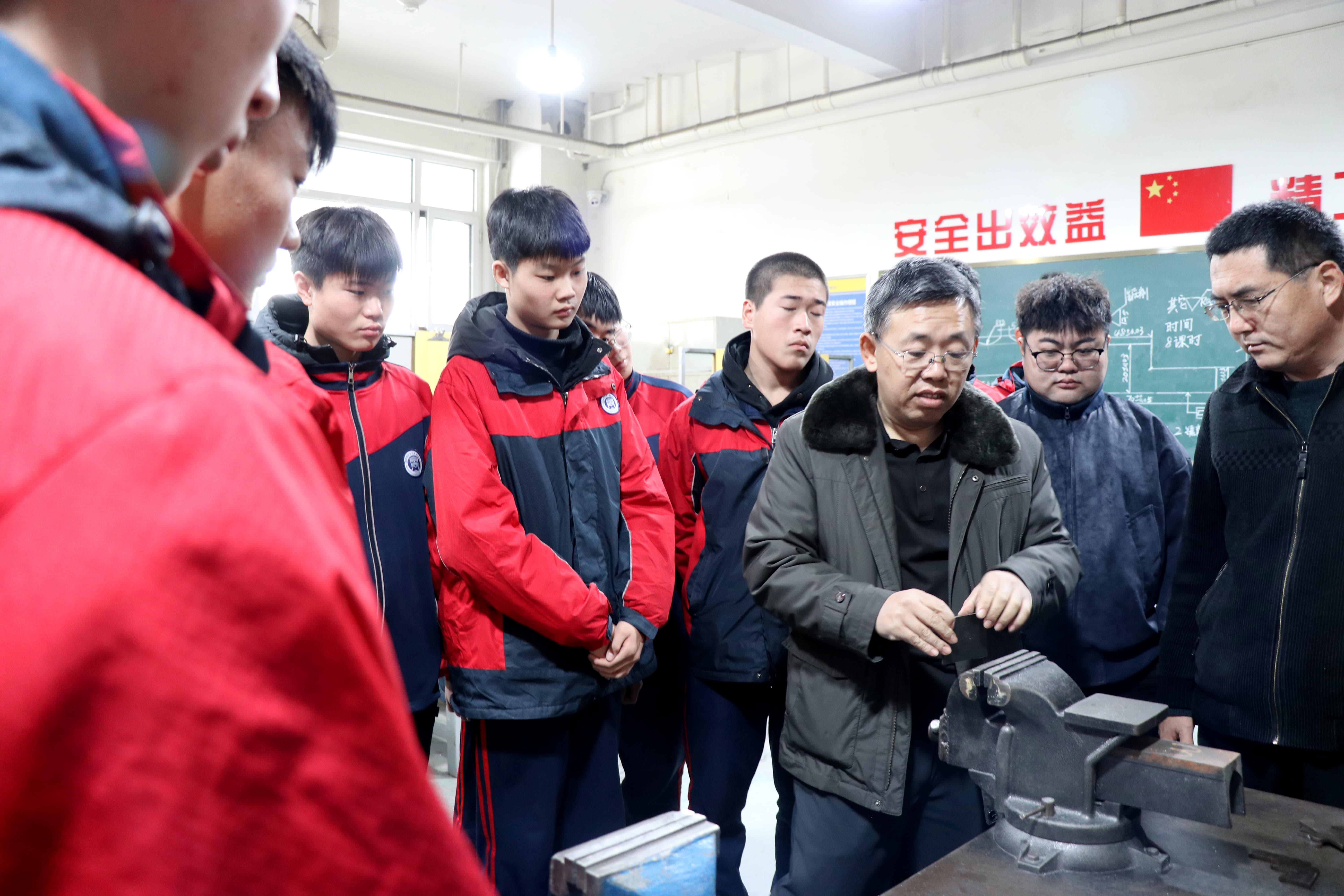 讲座结束后,张明利大师走进钳工实训场地,聚焦机加工专业学生的实操训练展开精准指导。他细致观察同学们的操作流程,耐心解答技能训练中遇到的难点问题,同时勉励大家要勤学苦练夯实基础,积极参与技能竞赛、考取职业证书,不断提升综合素养,以过硬本领书写人生华章。