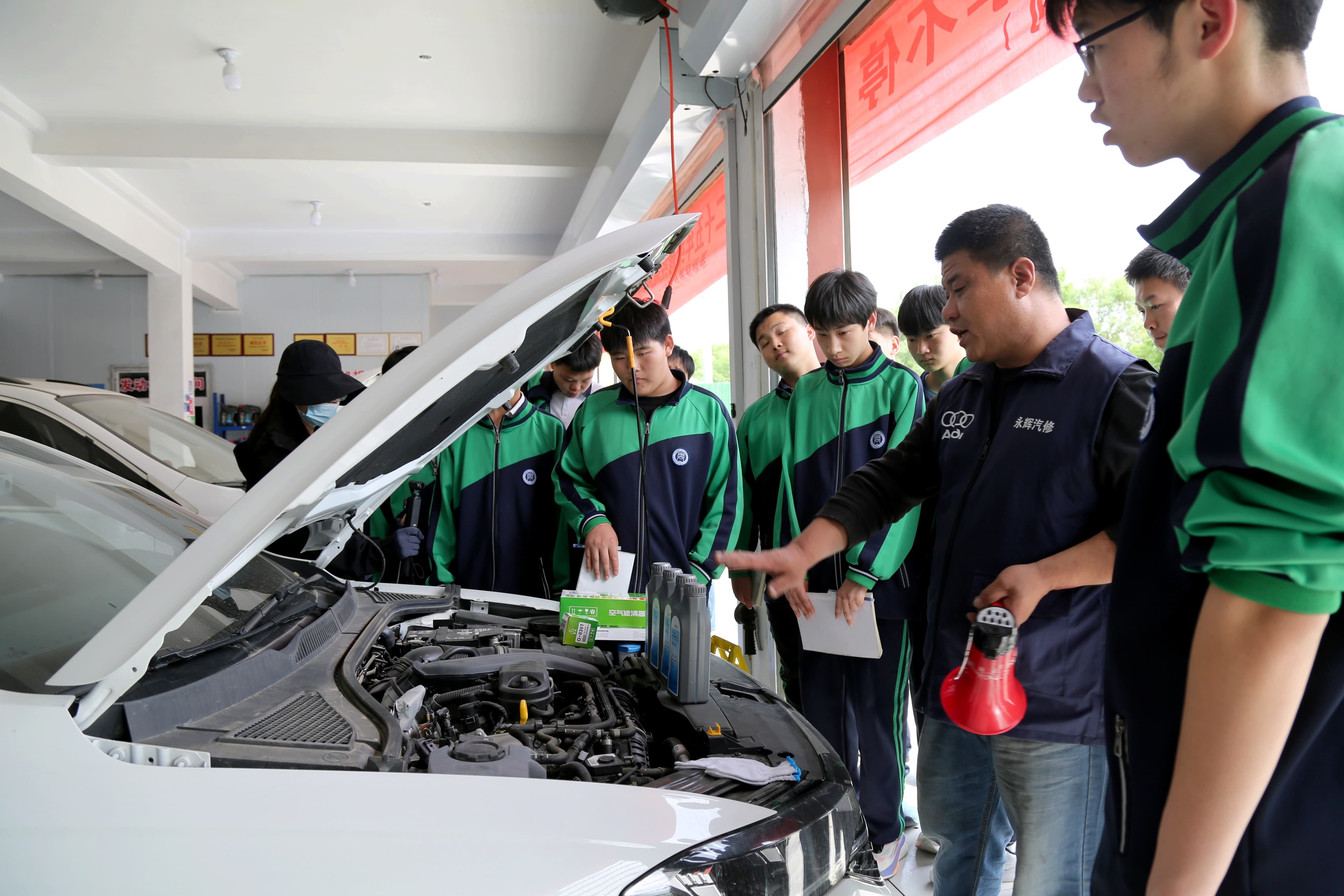 实训前期,校企双方紧密联动、精心谋划,共同制定科学详实的实践方案,围绕汽车构造、发动机检测、故障诊断、常规保养、维修安全等核心模块,开展系统性岗前培训,明确操作规范、实训目标与纪律要求。实践现场,企业技术骨干结合实车实操,逐一进行部件拆解演示、流程细化讲解,将课堂上抽象难懂的理论知识,转化为直观可感、可学可练的实操技能。同学们全程专注观摩、认真记录关键要点,主动提问交流,在技师与专业教师指导下,有条不紊地开展部件检查、基础维修等实操训练,在动手实践中查漏补缺、锤炼本领,切实提升自身动手操作能力与专业核心素养。