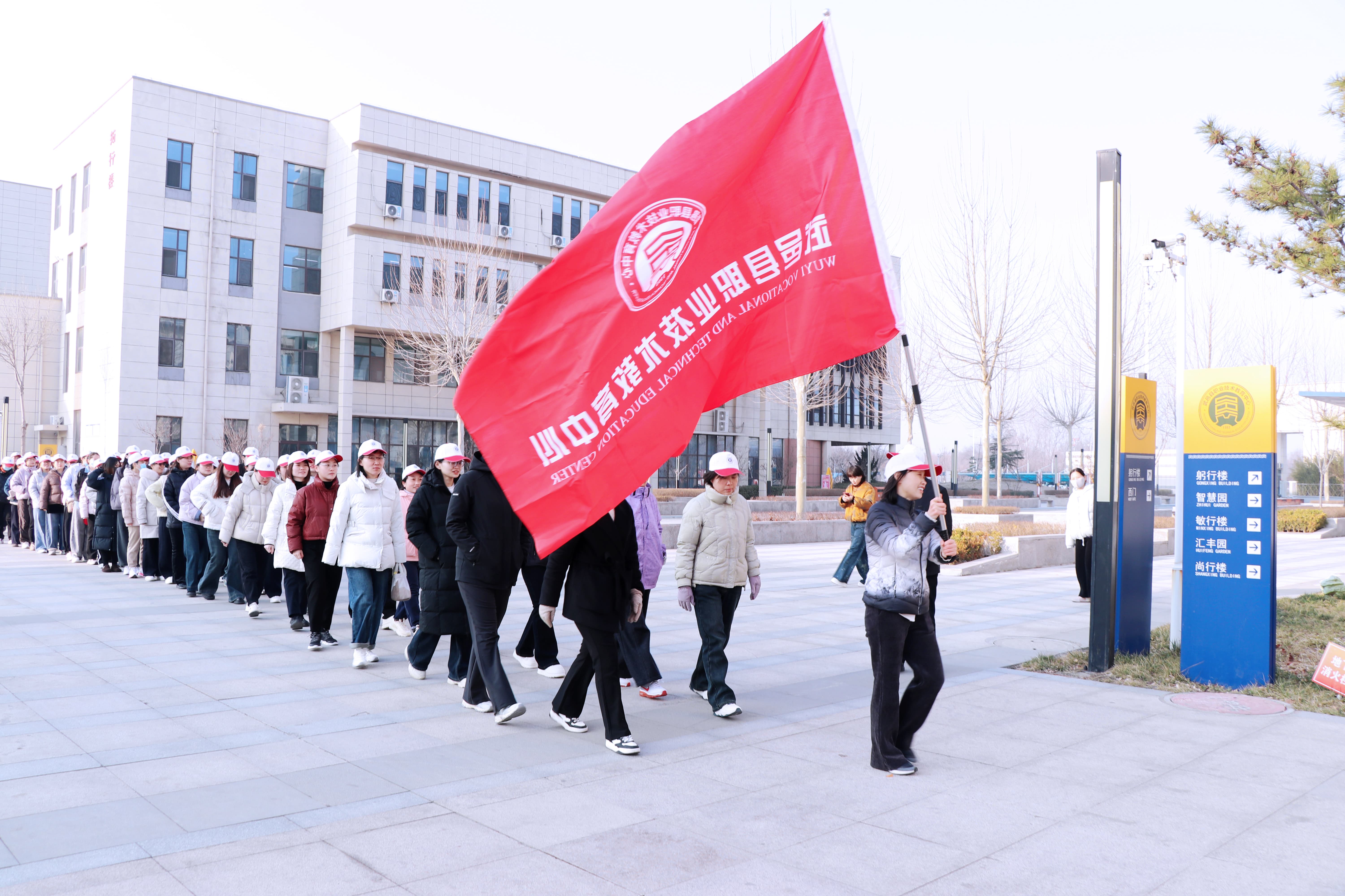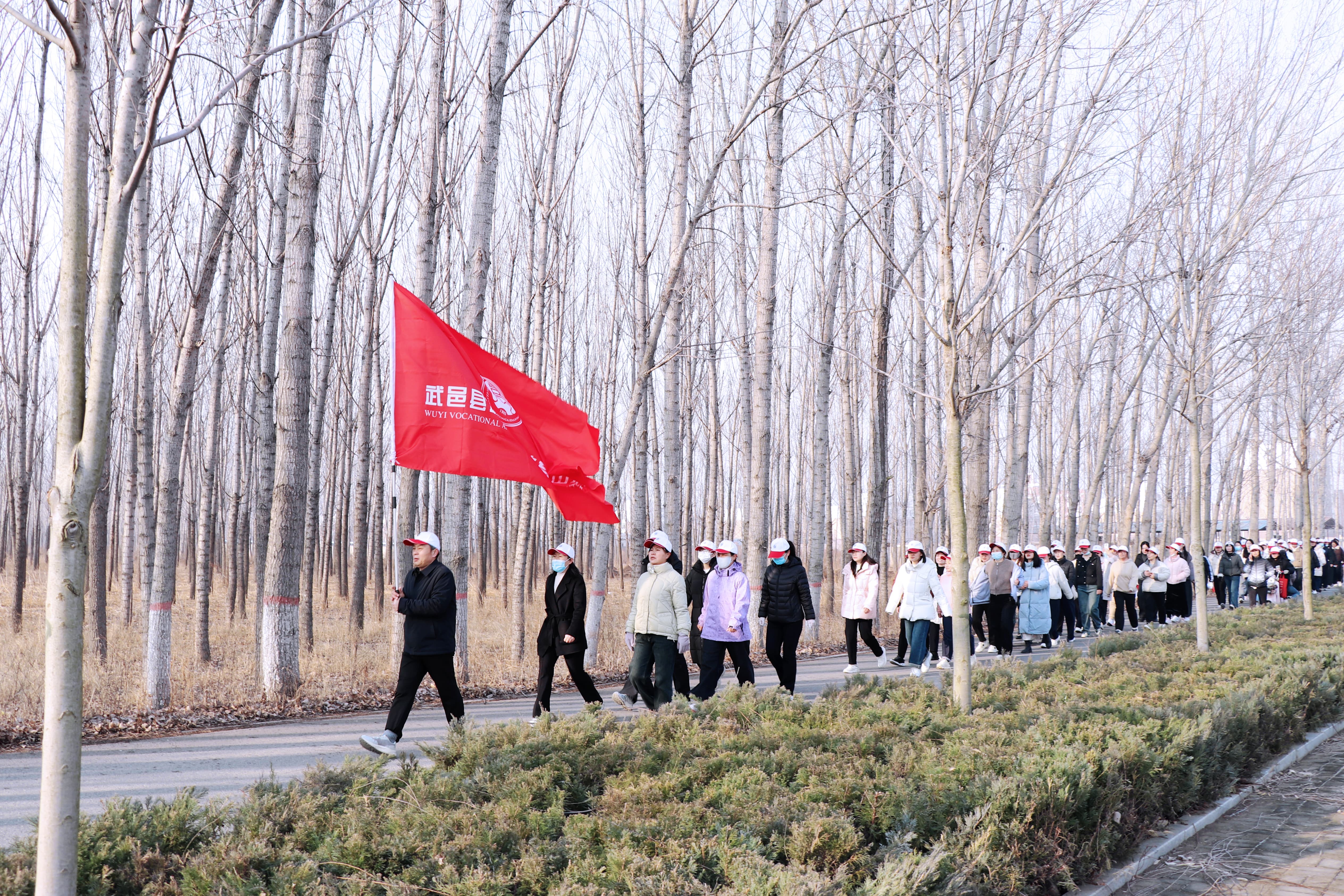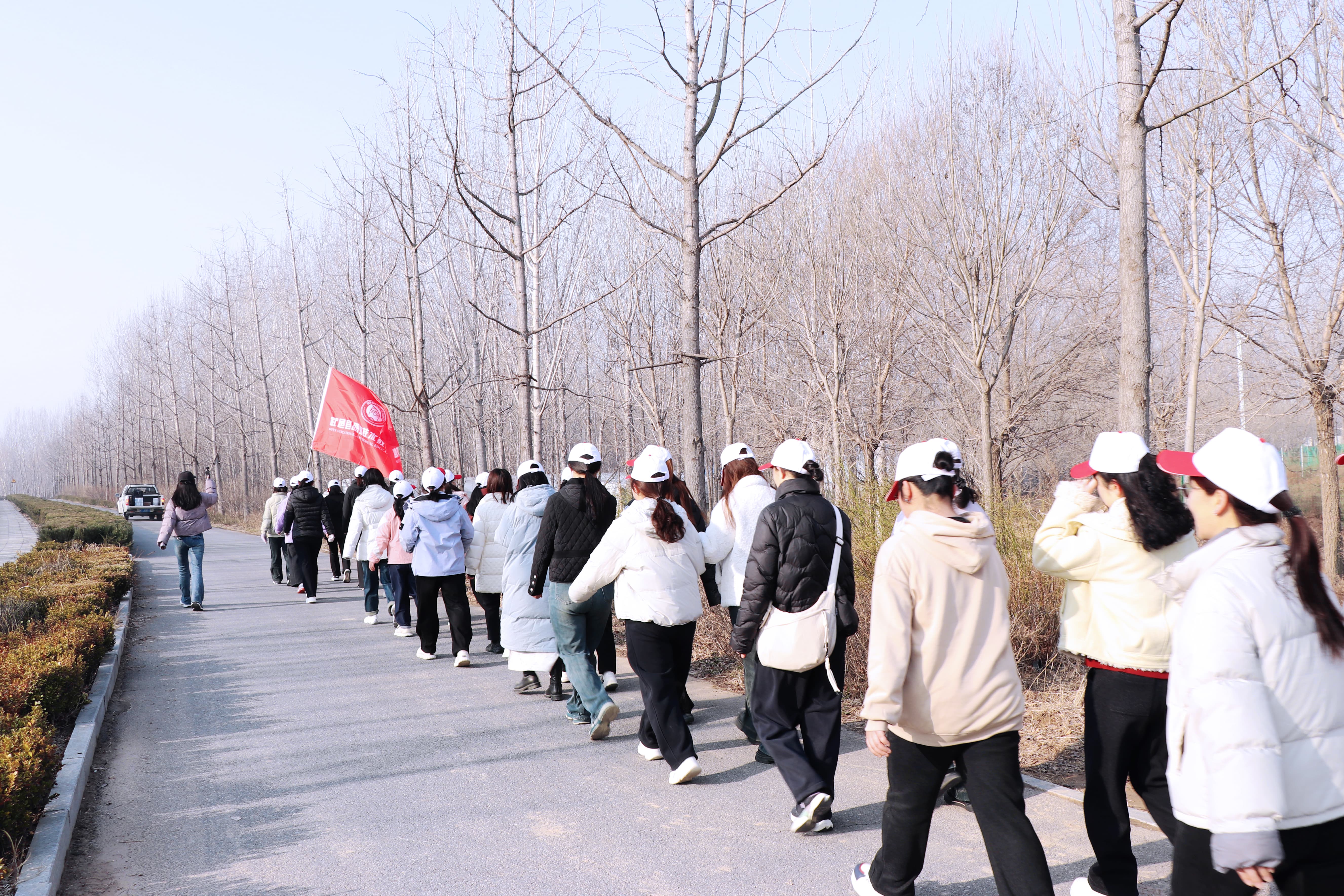 张校长为健步团队授旗,鲜红的旗帜点燃了大家的参与热情。大家整装出发、阔步向前,步履铿锵、彼此鼓劲,欢声笑语与春日生机相融,绘就别样巾帼风景。