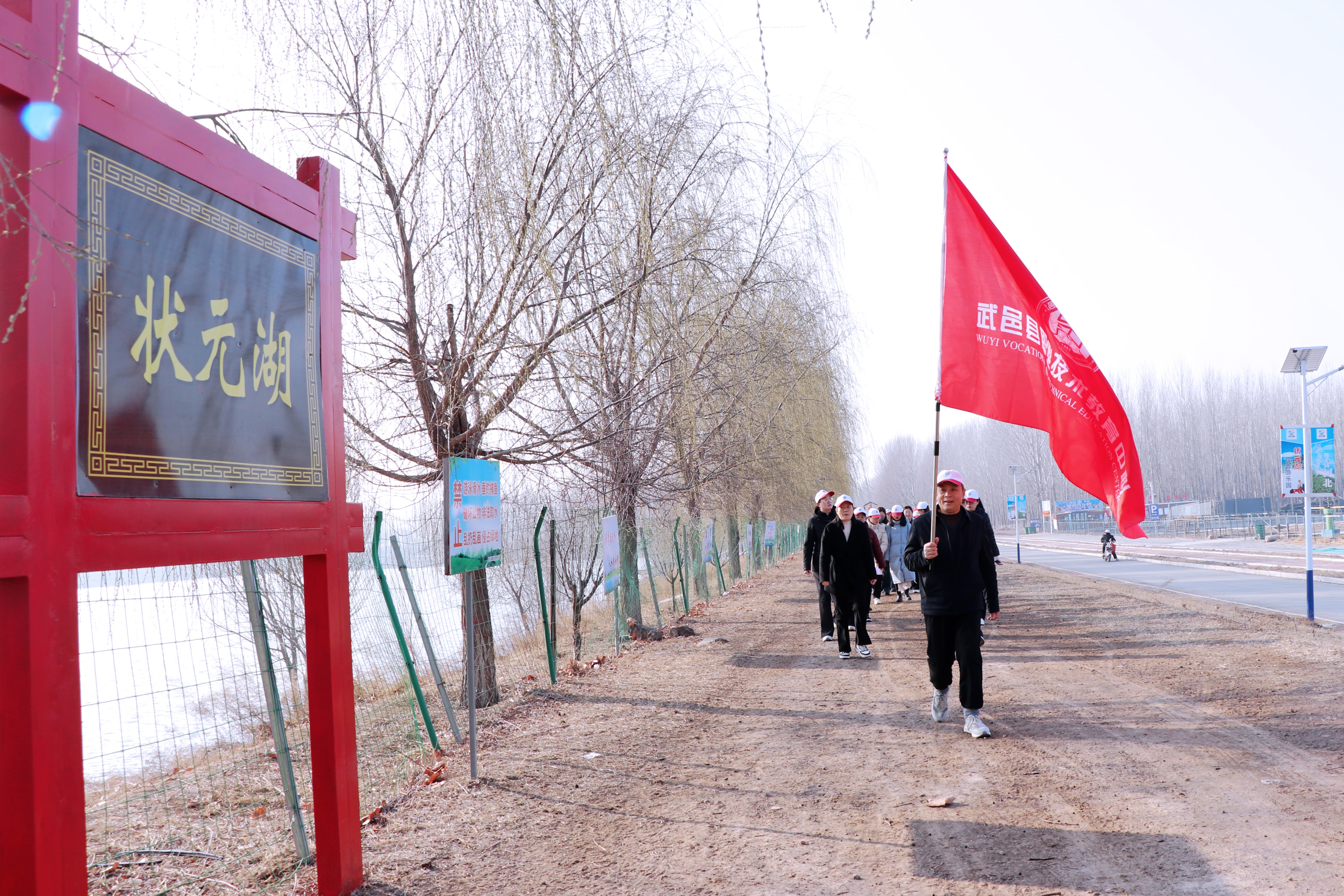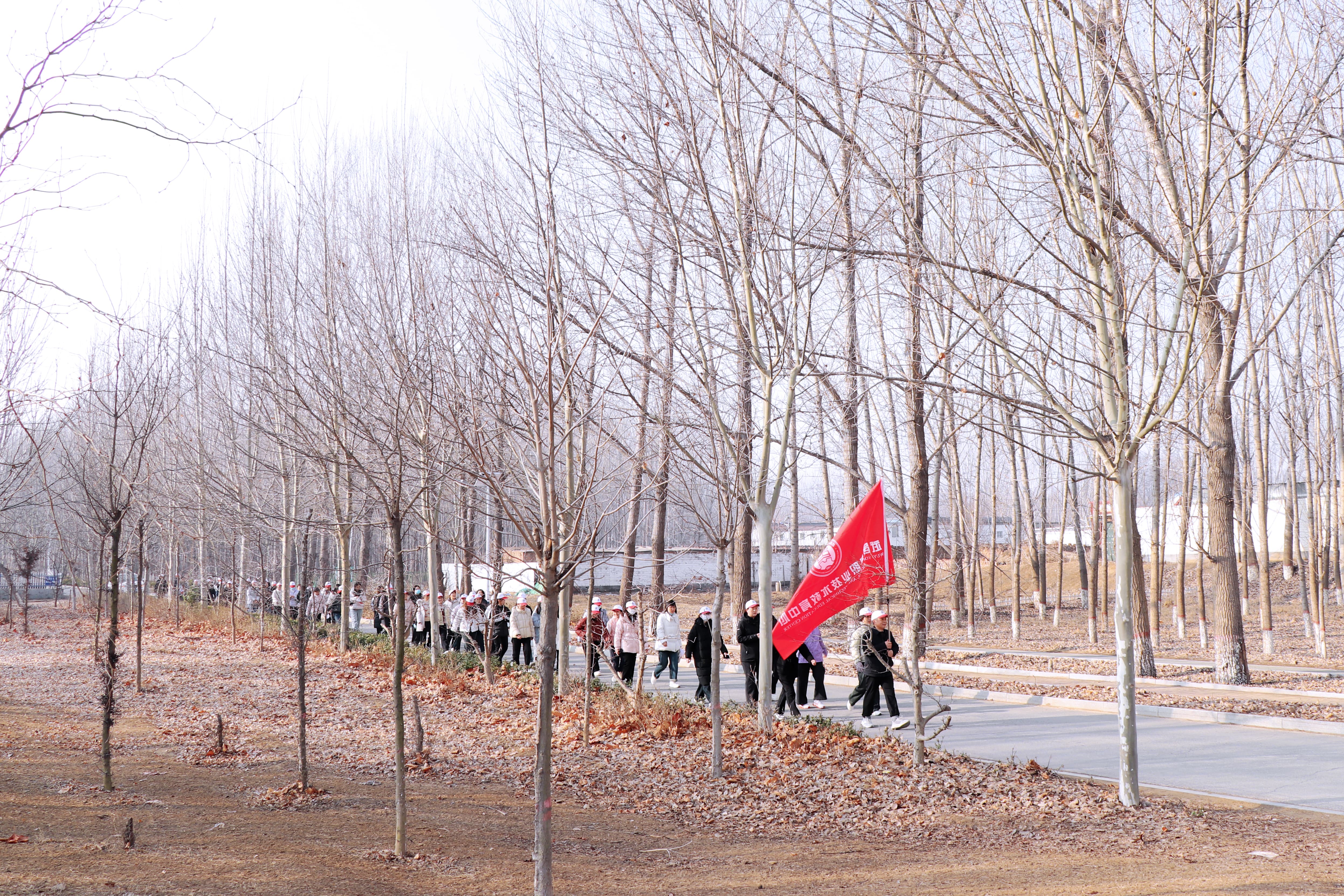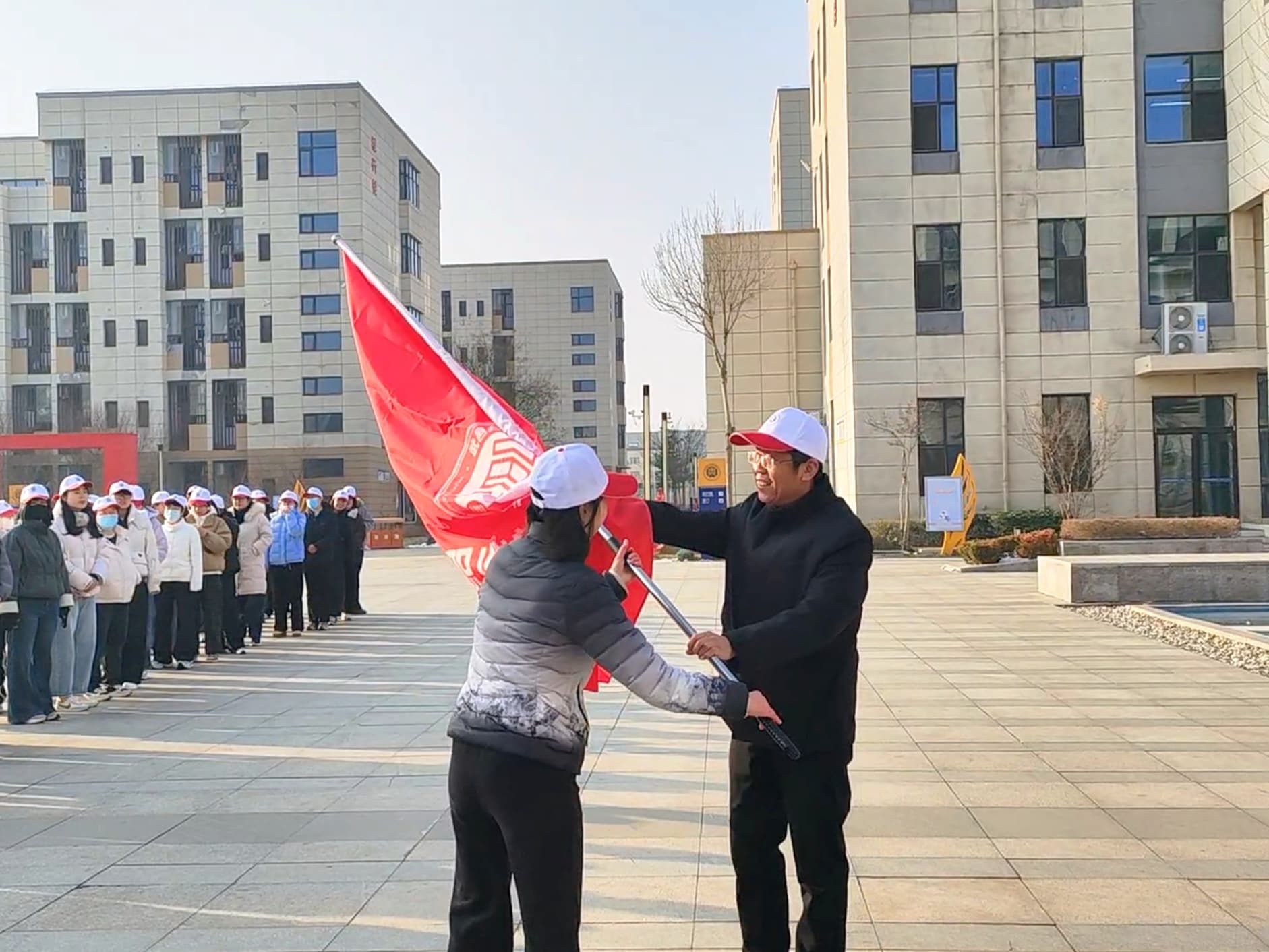 张校长为健步团队授旗,鲜红的旗帜点燃了大家的参与热情。大家整装出发、阔步向前,步履铿锵、彼此鼓劲,欢声笑语与春日生机相融,绘就别样巾帼风景。