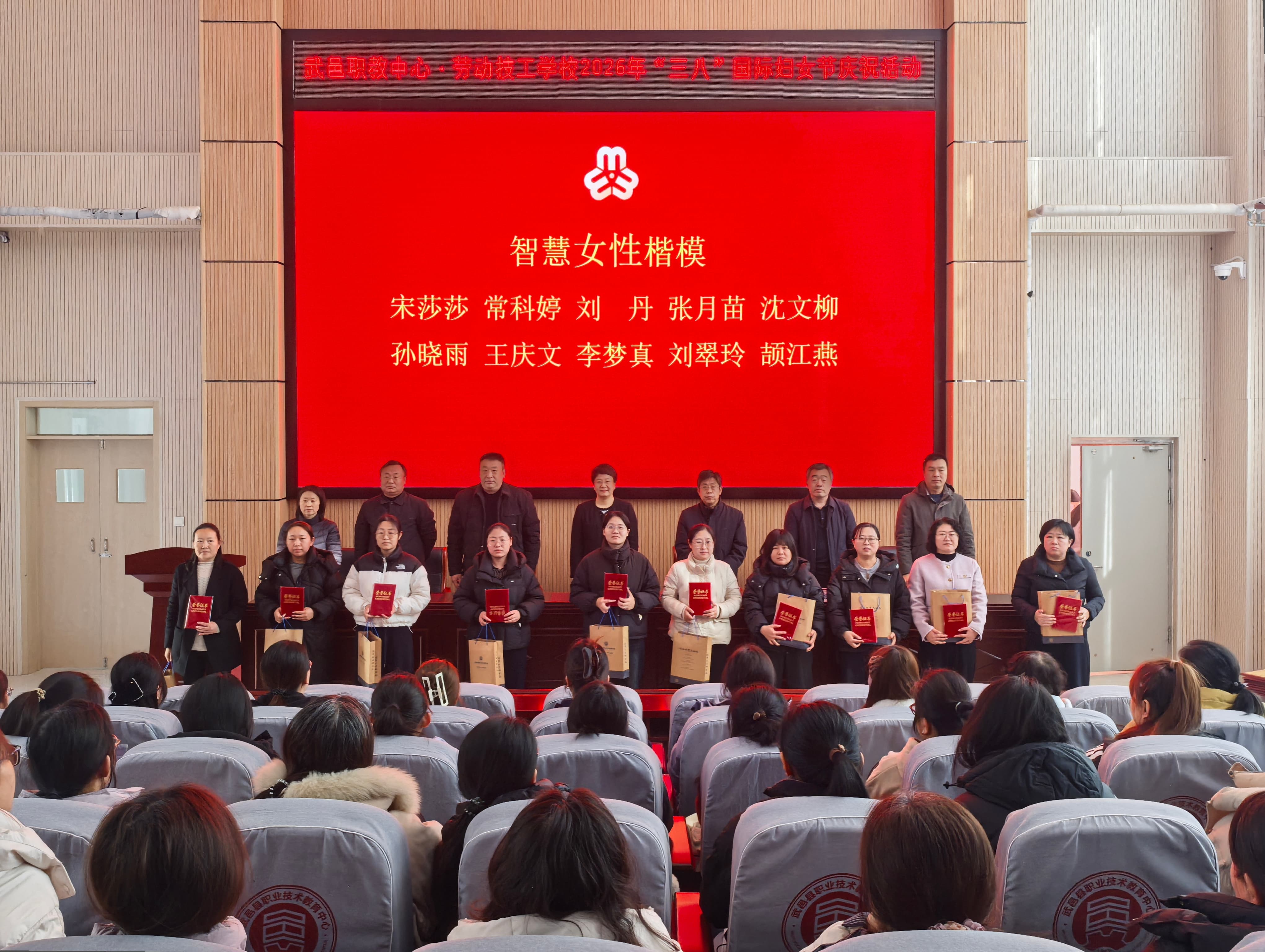 校党委副书记冯学军同志宣读《关于我校 2026 年 “三八” 国际劳动妇女节表彰决定》,现场为获奖的 10位 “智慧女性楷模”、8 个 “巾帼建功团队” 颁发荣誉证书,表彰她们在教育教学、管理服务等工作中作出的突出贡献。